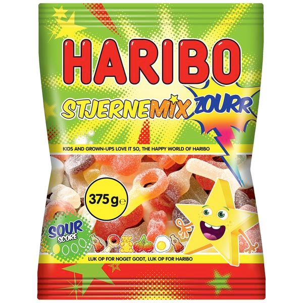 Glucosesirup, sukker, gelatine, dextrose, syrer: citronsyre, æblesyre, surhedsregulerende midler: calciumcitrat, natriumhydrogenmalat, aroma, frugt- og plantekoncentrater: spirulina, saflor, æble, citron, ræddike, sødkartoffel, gulerod, solbær, hibiscus, karamelliseret sukker, sirup af invertsukker, overfladebehandlingsmiddel: carnaubavoks. |